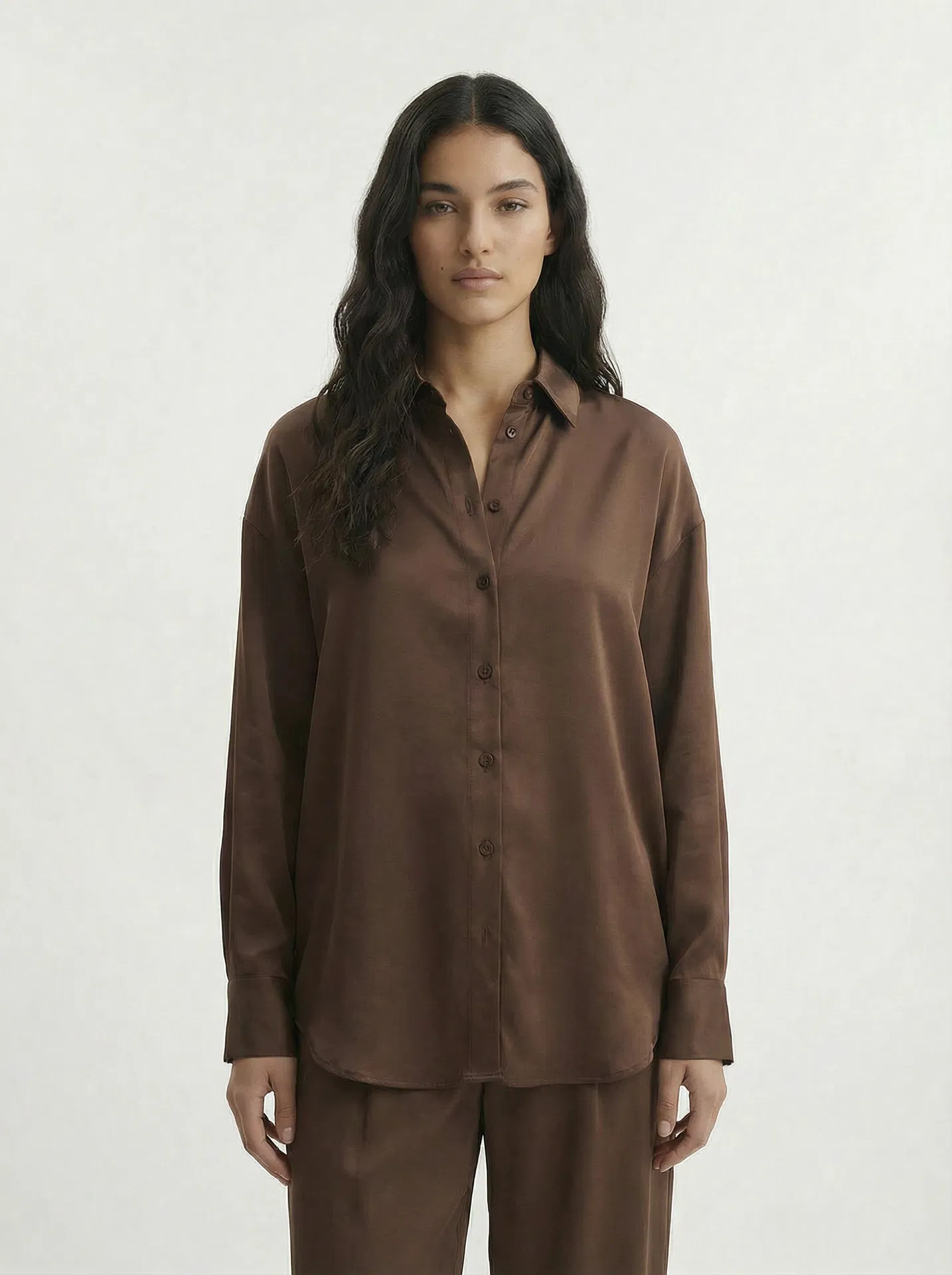 An oversized silk shirt in warm cacao with a classic collar and button-down front. The relaxed silhouette drapes effortlessly — rich, earthy, and endlessly versatile, whether layered over a slip dress or paired with matching silk trousers.