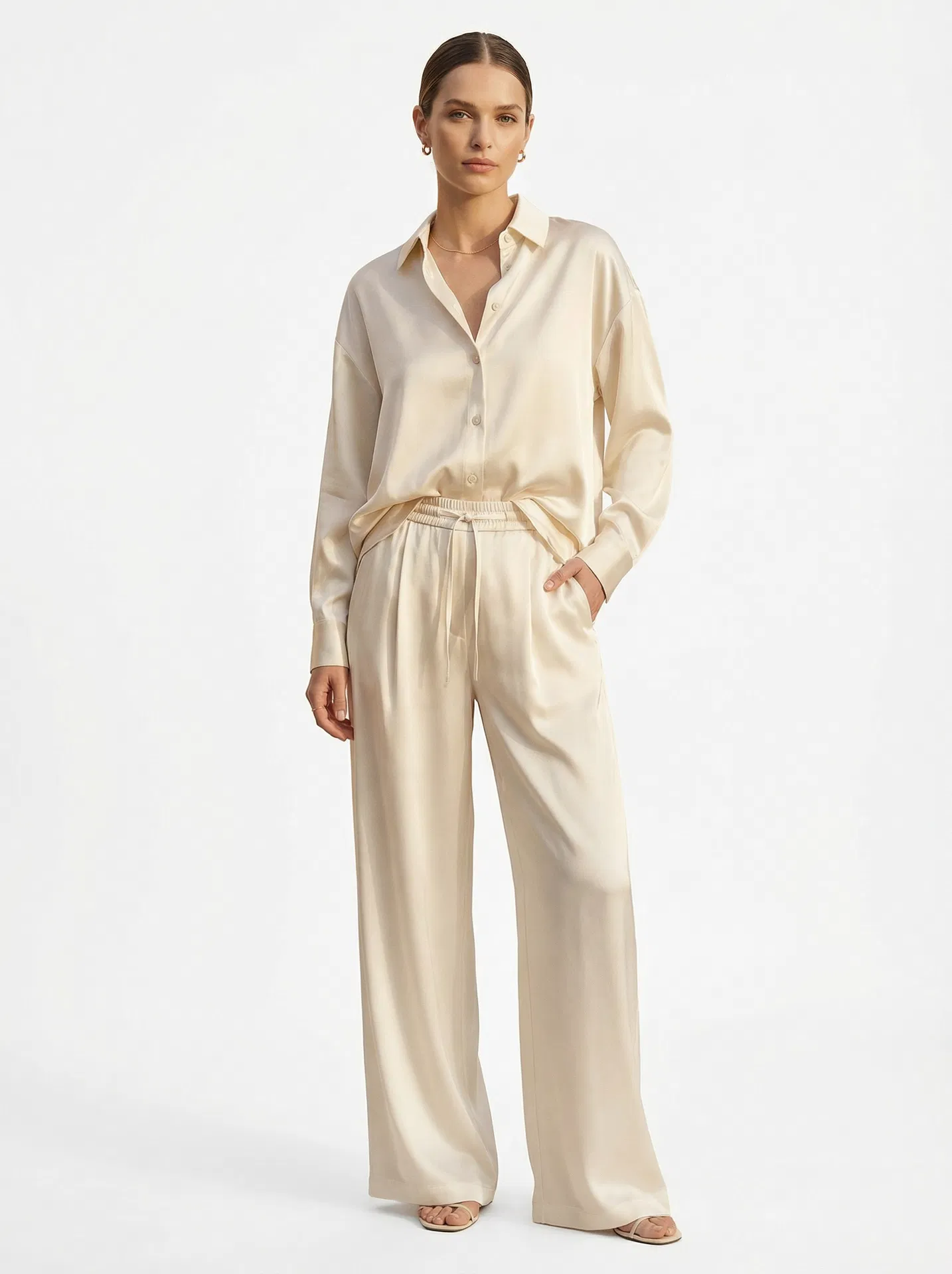 An elegant two-piece set in luminous ivory silk — an oversized button-down shirt paired with wide-leg trousers. Effortlessly refined, designed for the woman who moves between moments with grace.